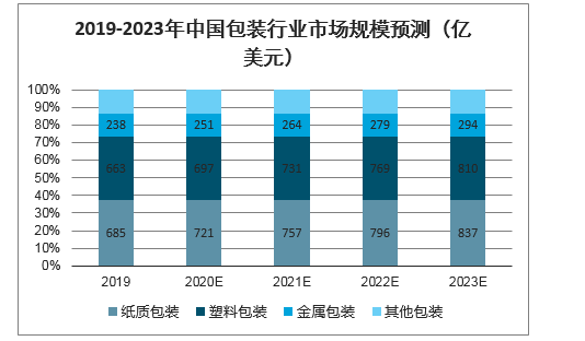 從我國現(xiàn)在包裝發(fā)展的情況預(yù)測,2020年中國包裝行業(yè)市場規(guī)模將突破1900億美元,約占亞太市場55%的份額,并將以約5%的速度持續(xù)增長,高于全球市場約4%的整體增長預(yù)期。其中,紙質(zhì)和塑料包裝分別占比約37%,金屬占比約13%。