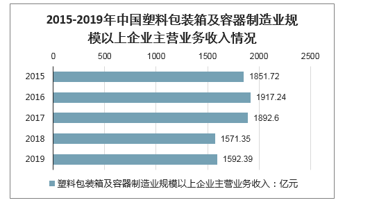 2015-2019年中國塑料包裝箱及容器制造業(yè)規(guī)模以上企業(yè)主營業(yè)務(wù)收入情況