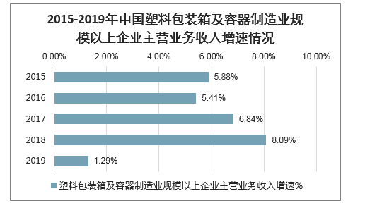 2015-2019年中國塑料包裝箱及容器制造業(yè)規(guī)模以上企業(yè)主營業(yè)務(wù)收入增速情況