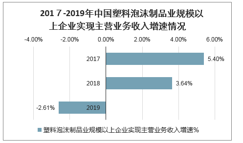 產(chǎn)量下降的同時,塑料泡沫制造業(yè)收入也隨之下降。2017-2019年,我國塑料泡沫制品業(yè)規(guī)模以上企業(yè)主營業(yè)務(wù)收入增速逐漸下降,2019年出現(xiàn)負(fù)增長。