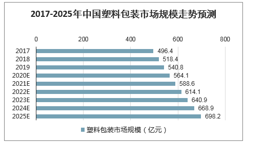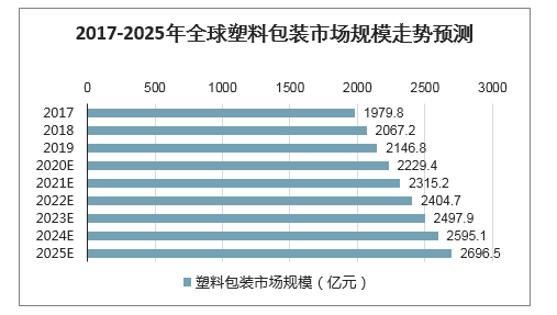 2017年全球塑料包裝市場規(guī)模為1979.8億美元,預(yù)計到2025年市場規(guī)模將達(dá)2696.5億美元;2017年中國塑料包裝市場規(guī)模為496.4億美元,預(yù)計到2025年市場規(guī)模將逼近700億美元。